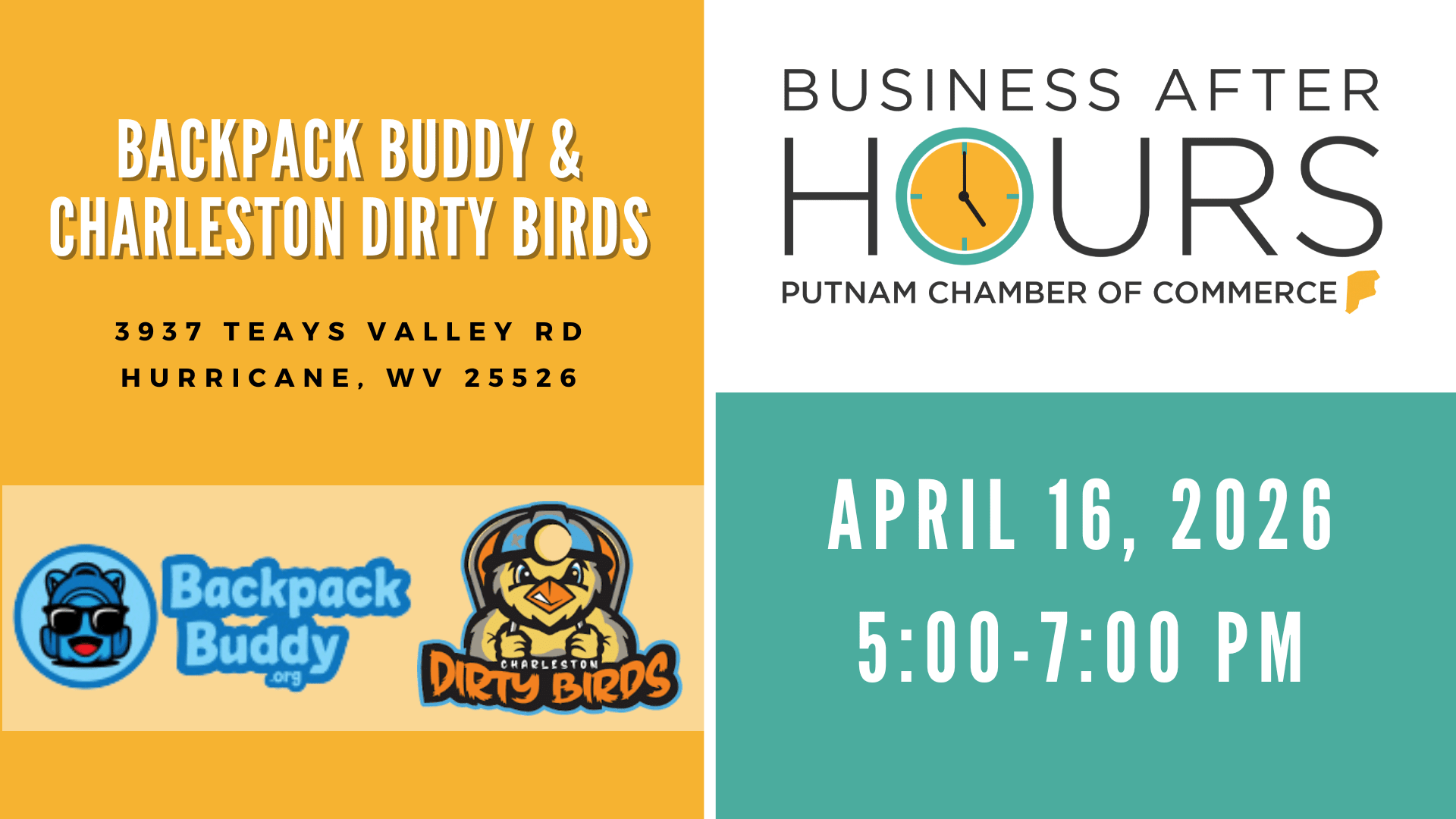 The next Business After Hours sponsored by The Putnam County Chamber of Commerce will be hosted by Backpack Buddy & Charleston Dirty Birds at Teays Valley Church of the Nazarene on Thursday, April 16. Business After Hours provides a social, but professional venue for business people to make new contacts and expand their presence in the business community. Participation is open to all Chamber members and RSVPs are required . There will be a cash drawing sponsored by Zach Crede of Crede Lawn Services at the event. RSVPs are requested by Wednesday, April 15. To obtain membership information or to make reservations, please contact the Chamber at 304.757.6510 or chamber@putnamcounty.org . You can also visit the Chamber website at www.putnamcounty.org for up-to-date information on the Chamber events.