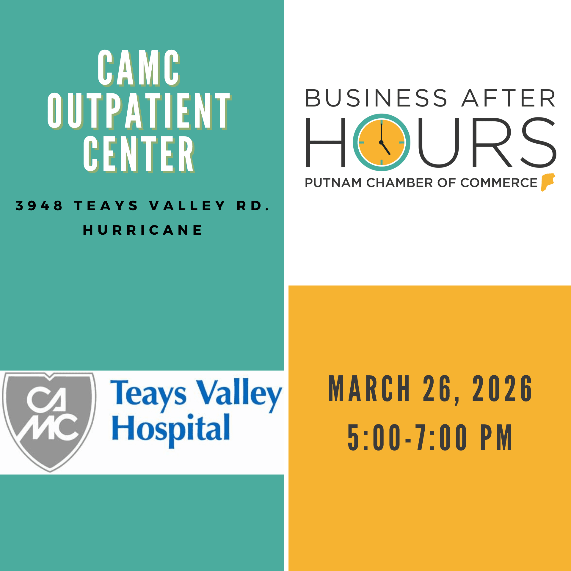 The next Business After Hours sponsored by The Putnam County Chamber of Commerce will be hosted by CAMC Outpatient Center on March 26, 2026. Business After Hours offers a social, but professional venue for business people to make new contacts and expand their presence in the business community. Participation is open to all Chamber members and RSVPs are required. There will be a cash drawing at the event. RSVPs are requested by Wednesday, March 25. To obtain membership information or to make reservations, please contact the Chamber at 304.757.6510 or chamber@putnamcounty.org . You can also visit the Chamber website at www.putnamcounty.org for up-to-date information on the Chamber events.Images