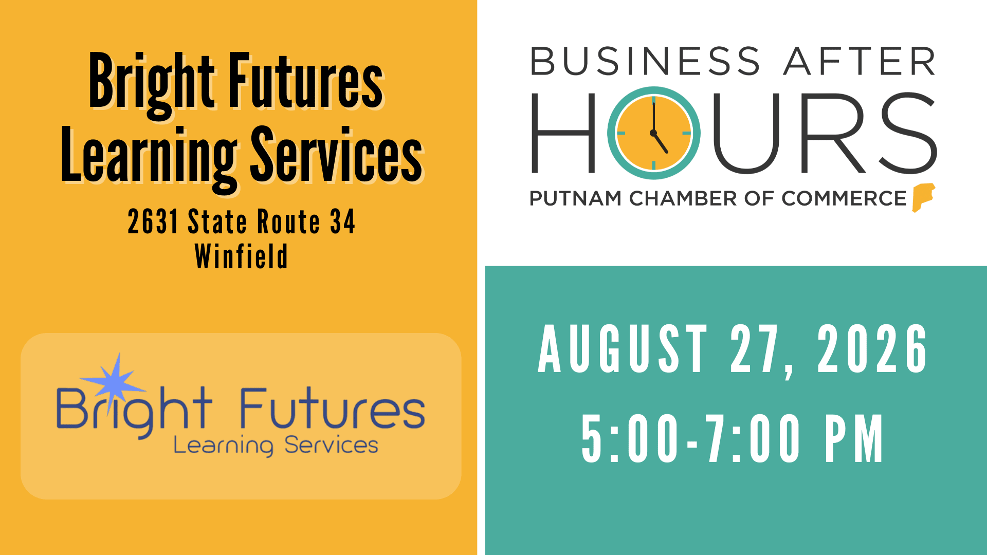 The next Business After Hours sponsored by The Putnam County Chamber of Commerce will be hosted by Bright Futures Learning Services on Thursday, August 27. Business After Hours provides a social, but professional venue for business people to make new contacts and expand their presence in the business community. Participation is open to all Chamber members and RSVPs are required . There will be a cash drawing at the event. RSVPs are requested by Wednesday, August 26. To obtain membership information or to make reservations, please contact the Chamber at 304.757.6510 or chamber@putnamcounty.org . You can also visit the Chamber website at www.putnamcounty.org for up-to-date information on the Chamber events.Images