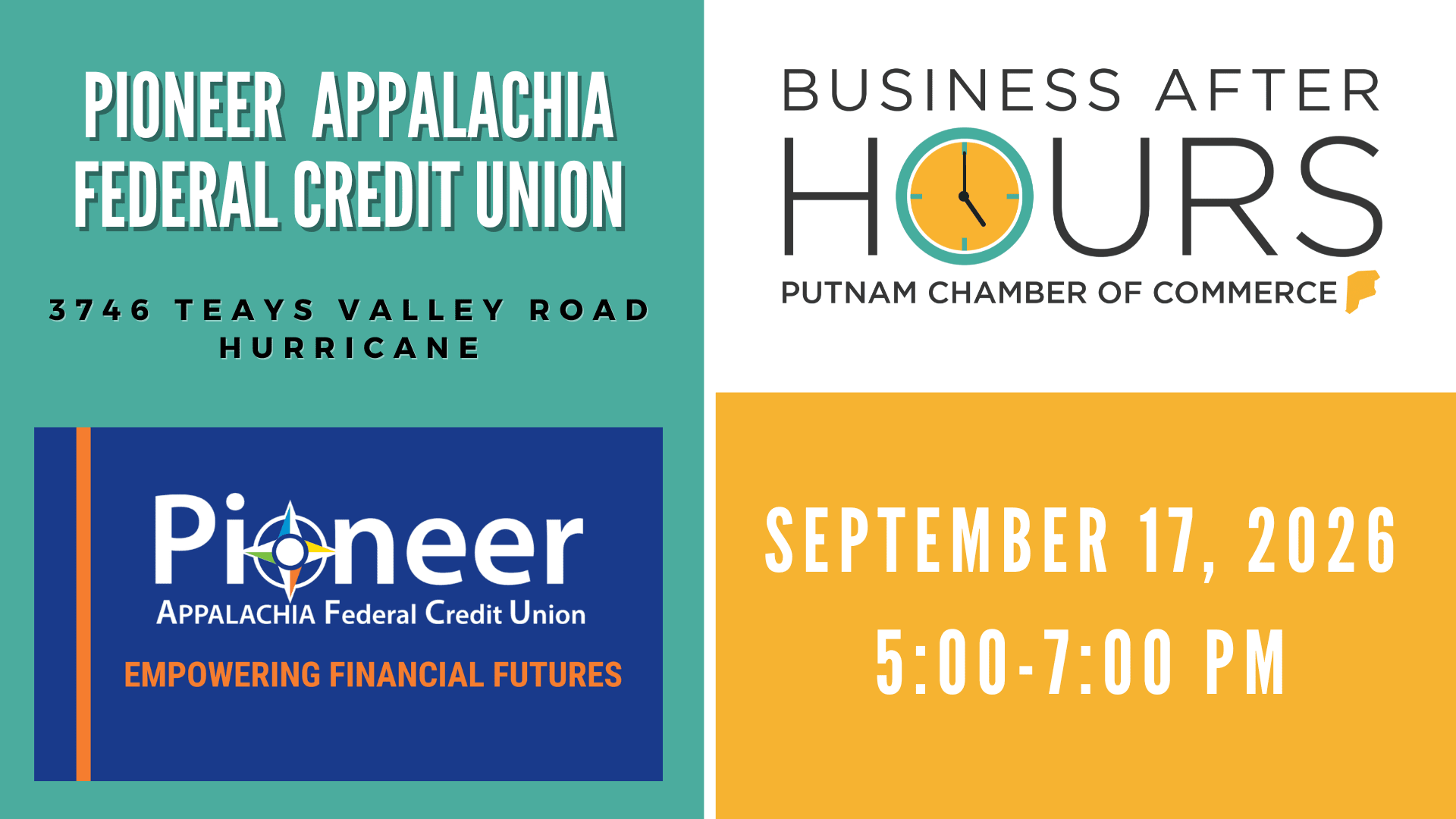 The next Business After Hours sponsored by The Putnam County Chamber of Commerce will be hosted by Pioneer Appalachia Federal Credit Union on Thursday, September 17. Business After Hours provides a social, but professional venue for business people to make new contacts and expand their presence in the business community. Participation is open to all Chamber members and RSVPs are required . There will be a cash drawing at the event. RSVPs are requested by Wednesday, September 16. To obtain membership information or to make reservations, please contact the Chamber at 304.757.6510 or chamber@putnamcounty.org . You can also visit the Chamber website at www.putnamcounty.org for up-to-date information on the Chamber events.