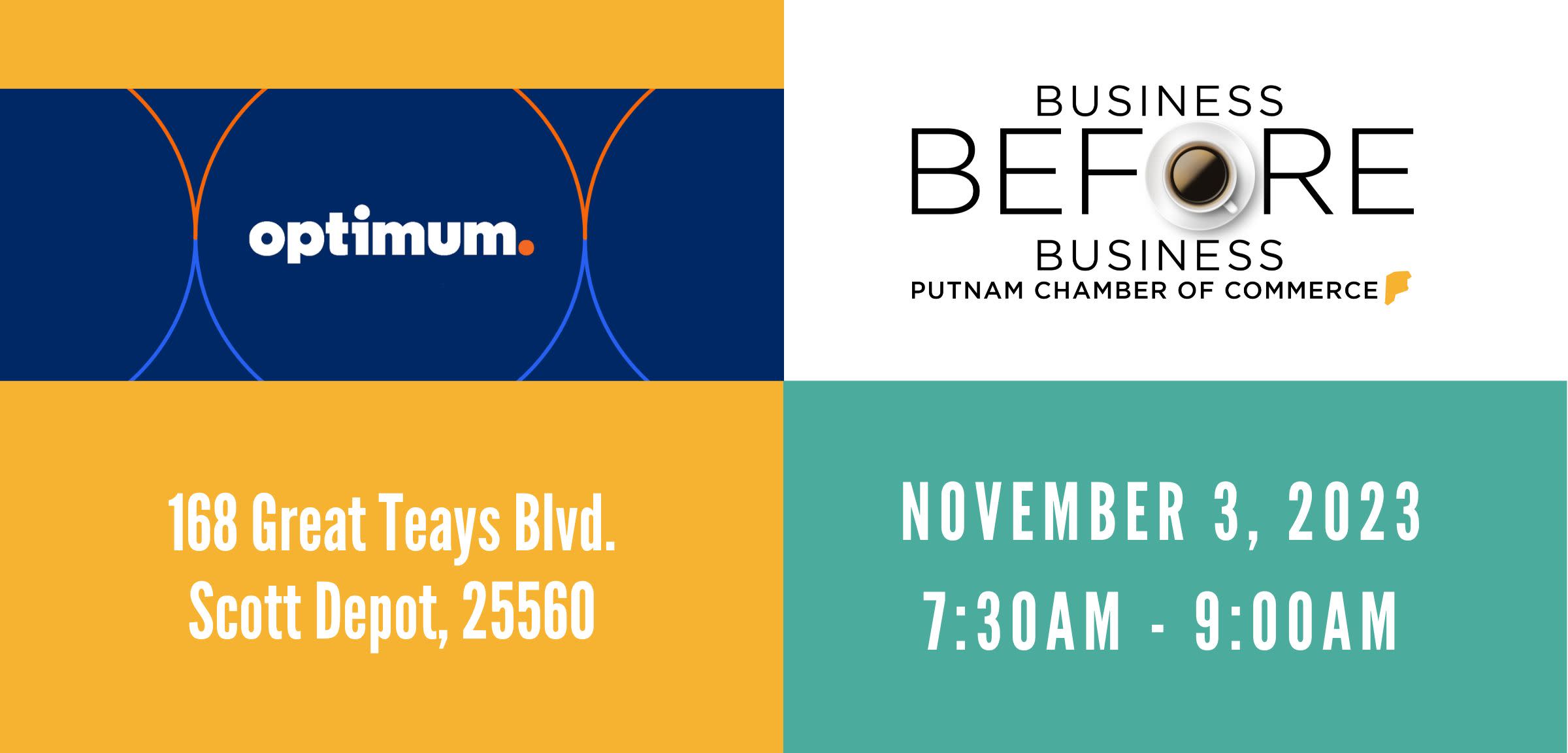 The next Business Before Business sponsored by the Putnam County Chamber of Commerce will be hosted by Optimum on Friday, November 3. Business Before Business provides an early morning social, but professional venue for business people to make new contacts and expand their presence in the business community. Participation is open to all Chamber members and their guests. This event is FREE to Chamber members, RSVPs are required . There will be a drawing for a free e-Billboard. Breakfast will also be included. RSVPs are required by Thursday, November 2. To obtain membership information or to make reservations, please contact the Chamber at 304.757.6510 or chamber@putnamcounty.org . You can also visit the Chamber website at www.putnamcounty.org for up-to-date information on the Chamber events.Images