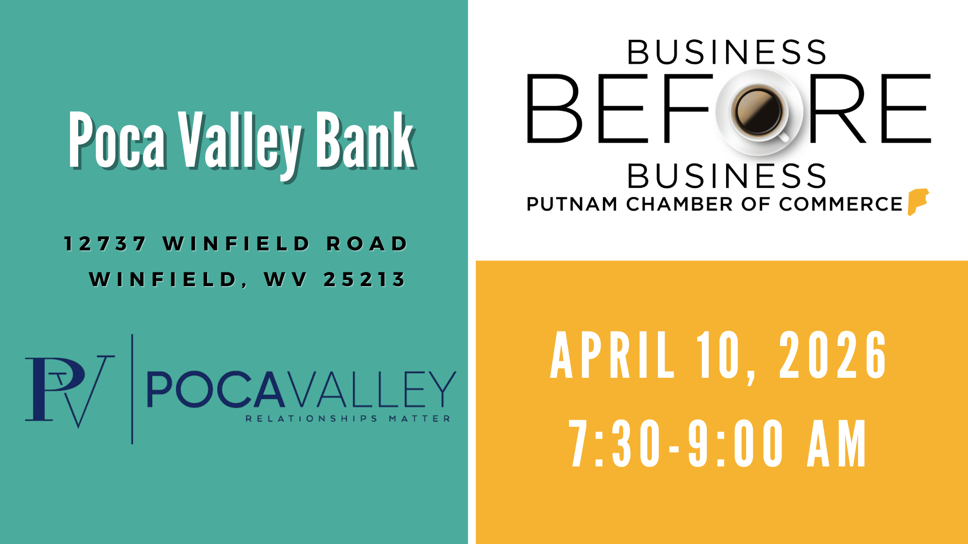 The next Business Before Business sponsored by the Putnam County Chamber of Commerce will be hosted by Poca Valley Bank on Friday, April 10. Business Before Business provides an early morning social, but professional venue for business people to make new contacts and expand their presence in the business community. Participation is open to all Chamber members and their guests. This event is FREE to Chamber members, and there will be a gift drawing. Breakfast will also be included. RSVPs are required by Thursday, April 9. To obtain membership information or to make reservations, please contact the Chamber at 304.757.6510 or chamber@putnamcounty.org . You can also visit the Chamber website at www.putnamcounty.org for up-to-date information on the Chamber events.