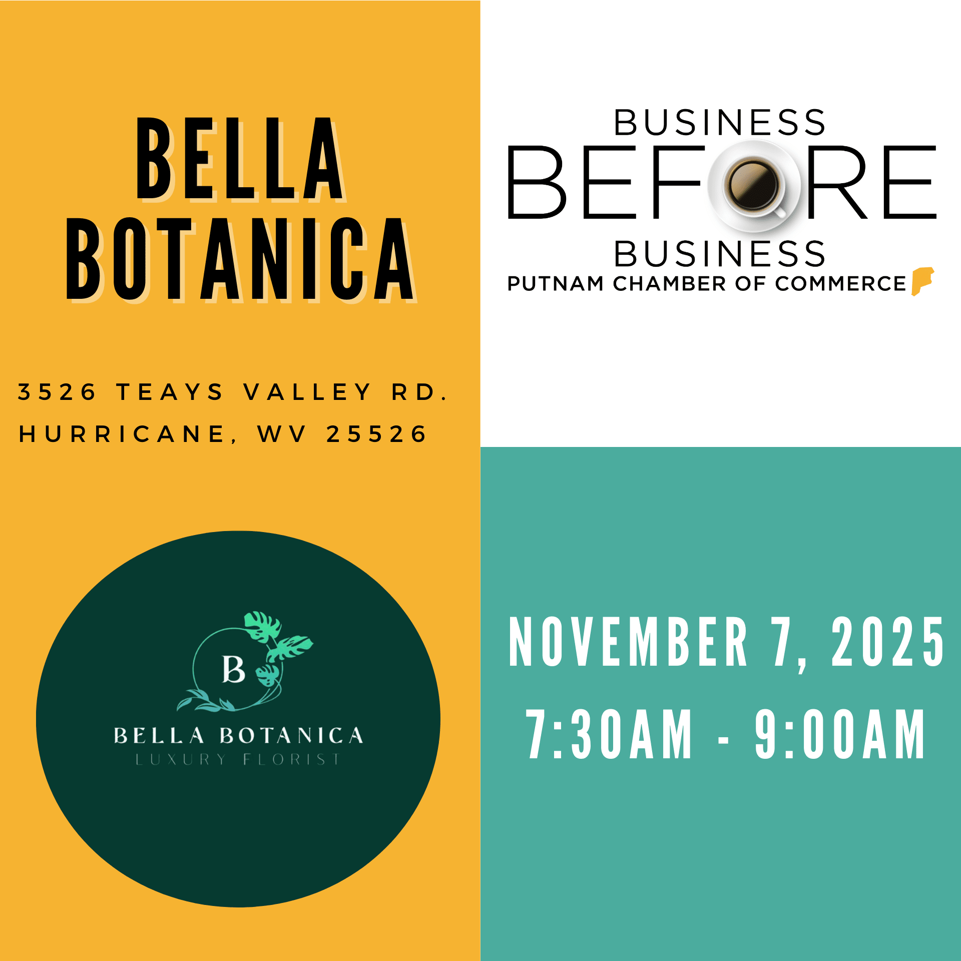 The next Business Before Business sponsored by the Putnam County Chamber of Commerce will be hosted by Bella Botanica on Friday, November 7. Business Before Business provides an early morning social, but professional venue for business people to make new contacts and expand their presence in the business community. Participation is open to all Chamber members and their guests. This event is FREE to Chamber members, and there will be a gift drawing. Breakfast will also be included. RSVPs are required by Thursday, November 6. To obtain membership information or to make reservations, please contact the Chamber at 304.757.6510 or chamber@putnamcounty.org . You can also visit the Chamber website at www.putnamcounty.org for up-to-date information on the Chamber events.