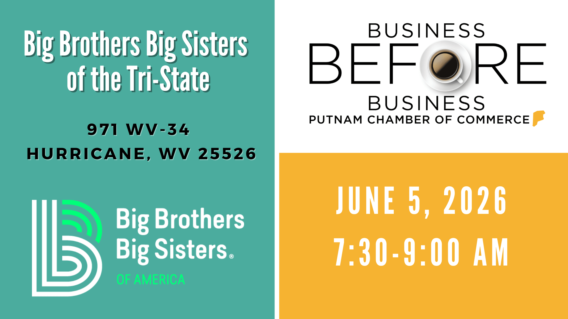 The next Business Before Business sponsored by the Putnam County Chamber of Commerce will be hosted by Big Brothers Big Sisters at Area 34 on Friday, June 5. Business Before Business provides an early morning social, but professional venue for business people to make new contacts and expand their presence in the business community. Participation is open to all Chamber members and their guests. This event is FREE to Chamber members, and there will be a gift drawing. Breakfast will also be included. RSVPs are required by Thursday, June 4. To obtain membership information or to make reservations, please contact the Chamber at 304.757.6510 or chamber@putnamcounty.org . You can also visit the Chamber website at www.putnamcounty.org for up-to-date information on the Chamber events.Images