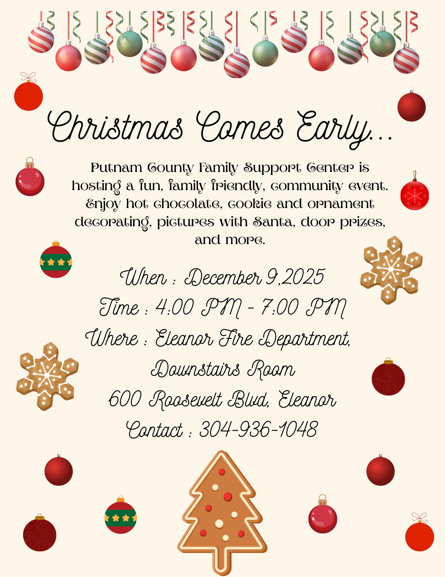 Putnam County Family Support Center is hosting a family-friendly community event that will consist of hot chocolate and cookies, ornament decorating, pictures with Santa, prizes, and more!Images