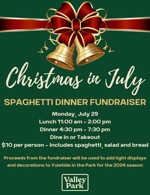 Christmas in July! 🎄 We are beginning our plans for the fall and Christmas season and we are super excited for everything we have coming up for the second half of 2024! We are kicking off planning the season with a 🍝 Spaghetti Dinner Fundraiser on Monday, July 29. The proceeds from this event will help allow us to add and replace lights and Christmas decor and create a destination for our community and beyond to visit and enjoy throughout the holidays. Visit the Valley Park Facebook page to find the link to get your tickets!