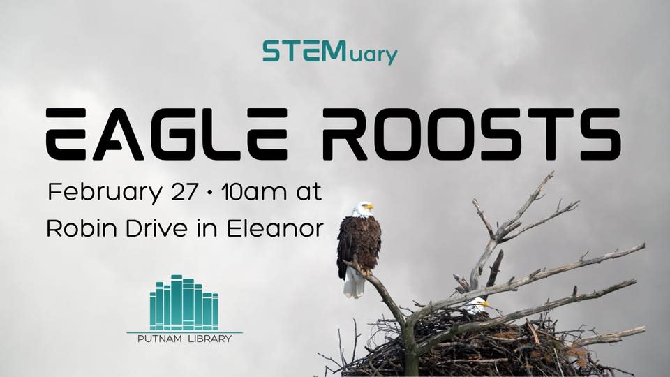 Bald eagles have been known to roost near the river in Eleanor, WV. Let’s go see if we can spot them and the nests they're building! Wear warm gear and bring binoculars if you have them to go eagle spotting with us near the locks on the Kanawha River in Eleanor on Friday, February 27 at 10am. (Note: the address you'll want to plug into your map is Robin Drive in Eleanor, which is near the National Guard Armory just outside of town limits.)Images