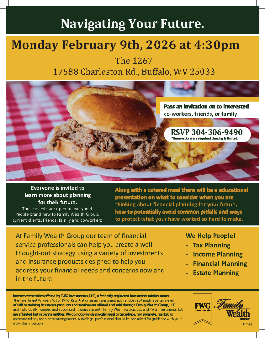Everyone is invited to learn more about planning their future with Family Wealth Group. Along with a catered meal there will be an educational presentation on what to consider when you are thinking about financial planning for your future, how to potentially avoid common pitfalls and ways to protect what you have worked so hard to make.