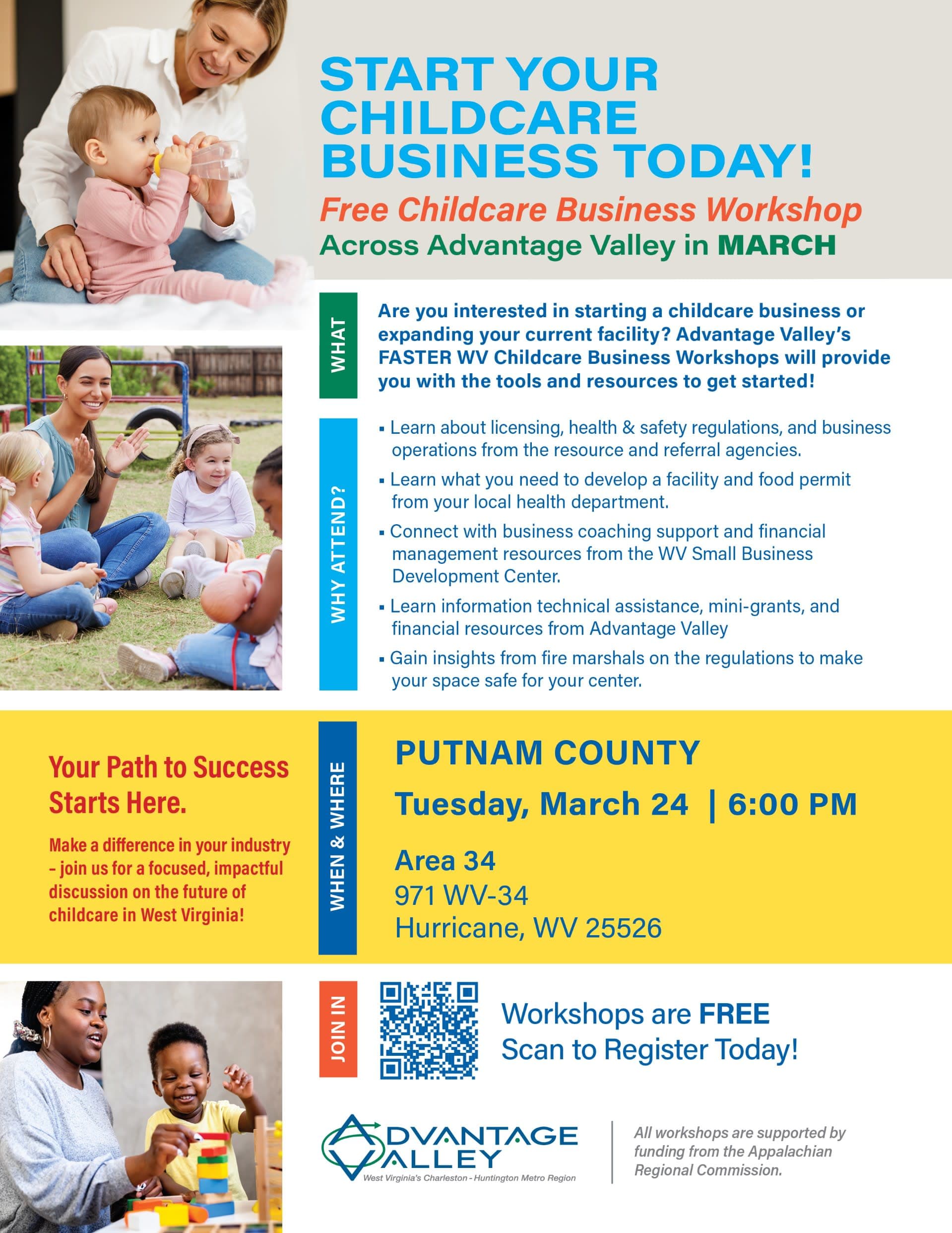 Are you interested in starting a childcare business or expanding your current facility? Advantage Valley's Faster WV Childcare Business Workshop will provide you with the tools and resources you'll need to get started. This workshop is FREE!Images