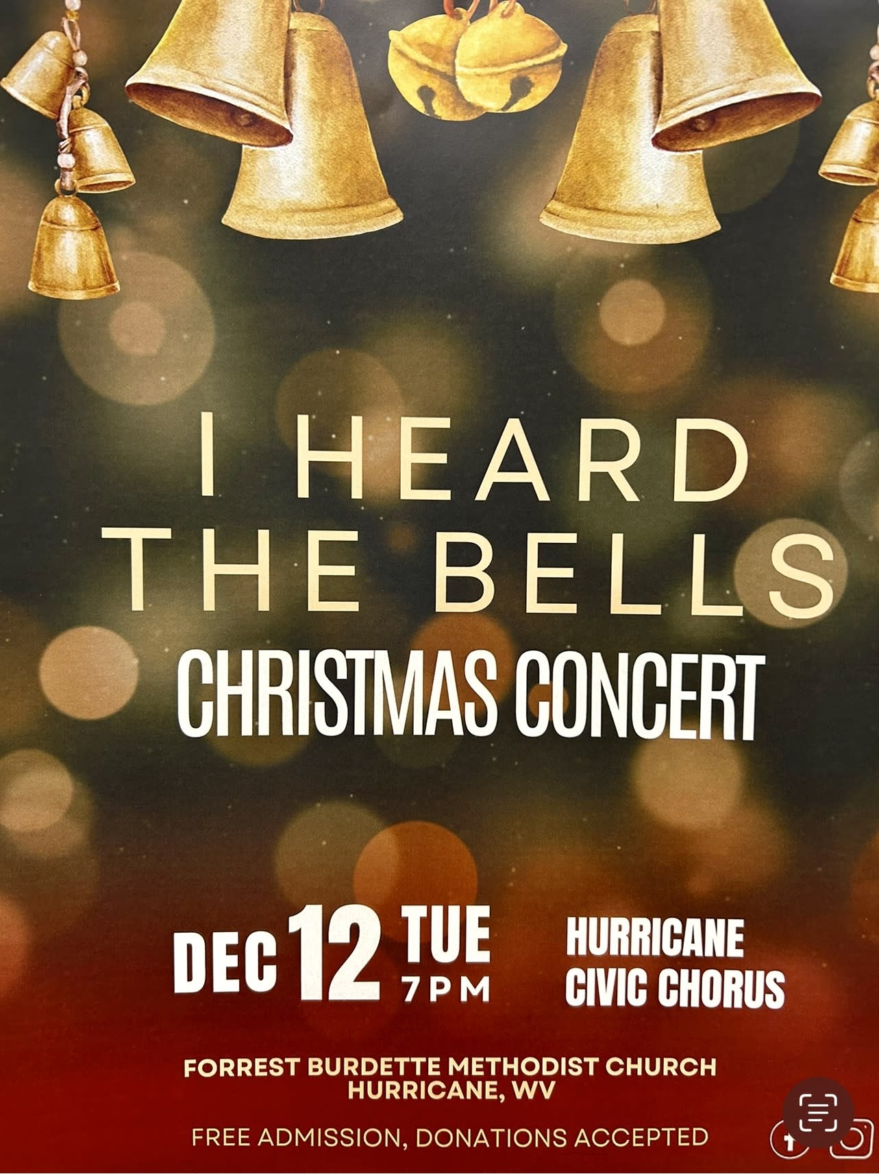 Join us for a FREE concert 'I heard the Bells', presented by The Hurricane Civic Chorus at Forrest Burdette United Methodist Church in Hurricane. Donations are accepted.Images
