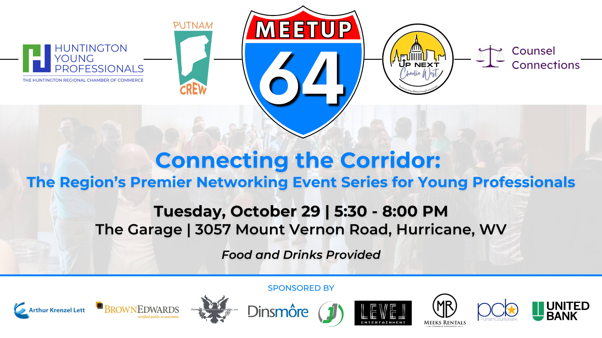 Join us for the fourth Meet-Up 64, an exciting collaborative networking event bringing together professionals from Up Next Charlie West, Putnam CREW, Huntington Young Professionals, and Counsel Connections! As the premier networking series in West Virginia, Meet-Up 64 offers a unique opportunity for young professionals to connect and collaborate.