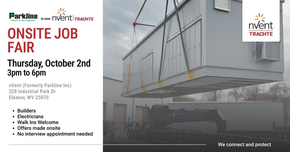 nVent Trachte (formerly Parkline) in Eleanor is growing and is hiring! 🎉 Check out their upcoming job fair on October 2nd and consider applying to this great company! Mark your calendars for an Onsite Job Fair next Thursday, October 2nd from 3pm to 6pm at our West Virginia Facility located at 328 Industrial Park Dr, Eleanor, WV 25070. Now Hiring: - Builders - Electricians - Walk-ins welcome, no interview appointment needed - Offers will be made day of the event Please visit our Careers page for a full list of opportunities and to apply today!Images