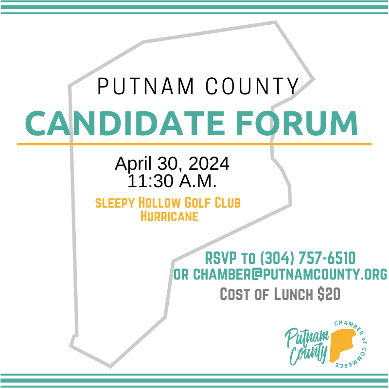 The Putnam County Chamber of Commerce will host one candidate forum for the primary election. To RSVP for the forum, please do so online or by emailing chamber@putnamcounty.org. DATE: WEDNESDAY, APRIL 22 TIME: DOORS OPEN AT 11:30 A.M. THE FORUM WILL BEGIN AT 12:00 P.M. LOCATION: SLEEPY HOLLOW GOLF CLUB 3780 Sleepy Hollow Dr, Hurricane, WV 25526 LUNCH: $20Images