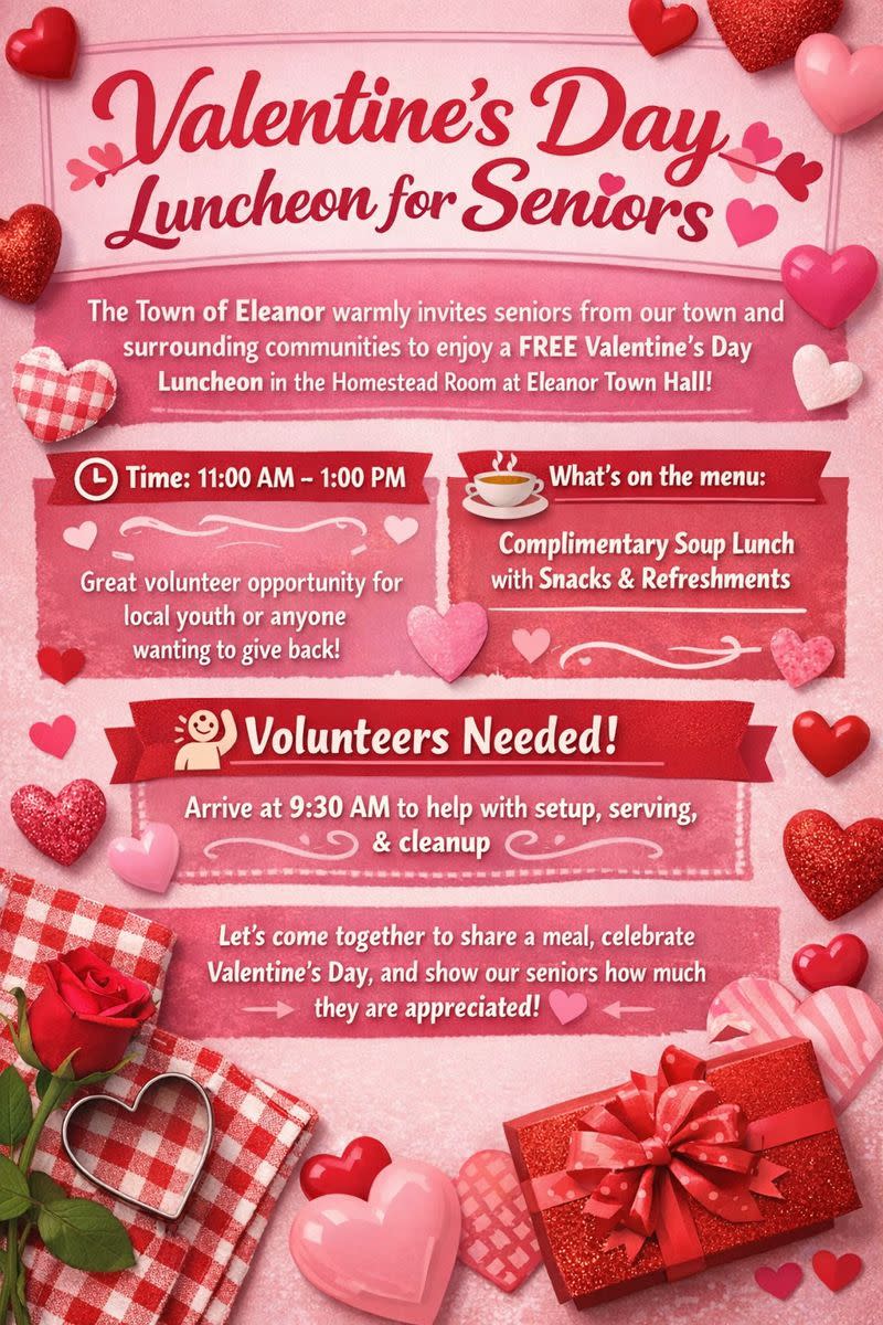 Valentine’s Day Luncheon for Seniors 💖 The Town of Eleanor warmly invites seniors from our town and surrounding communities to enjoy a FREE Valentine’s Day Luncheon in the Homestead Room at Eleanor Town Hall. 🕚 Time: 11:00 AM – 1:00 PM 🍲 What’s on the menu: A complimentary soup lunch with snacks and refreshments This event is also a wonderful community service opportunity for local youth who need volunteer hours—or for anyone who simply wants to give back and spend time with our senior community. All are welcome! 🙋 Volunteers Needed: Volunteers are asked to arrive at 9:30 AM to assist with setup, help serve food during the luncheon, and stay afterward to help with cleanup. Let’s come together to share a meal, celebrate Valentine’s Day, and show our seniors how much they are appreciated! 💕Images
