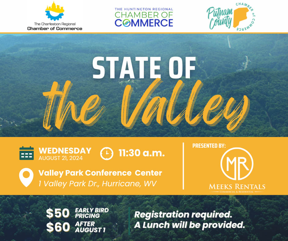The State of the Valley presented by Meeks Rentals & Leasing, enters its second year as an exciting event, collaboratively hosted by the Charleston Regional, Huntington Regional, and Putnam County Chambers of Commerce.